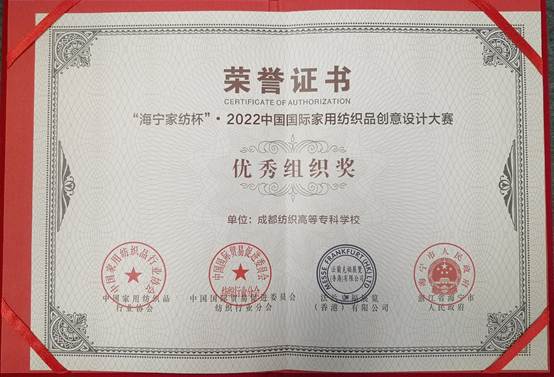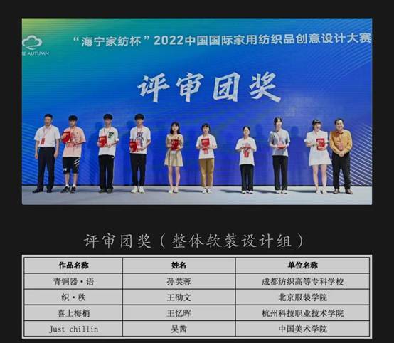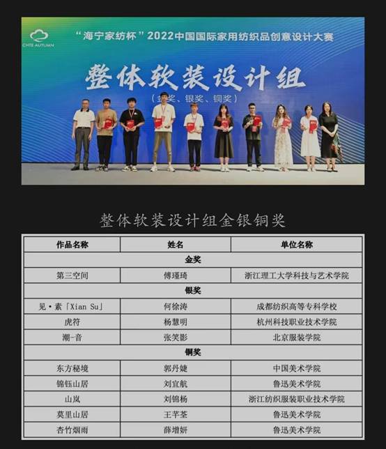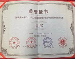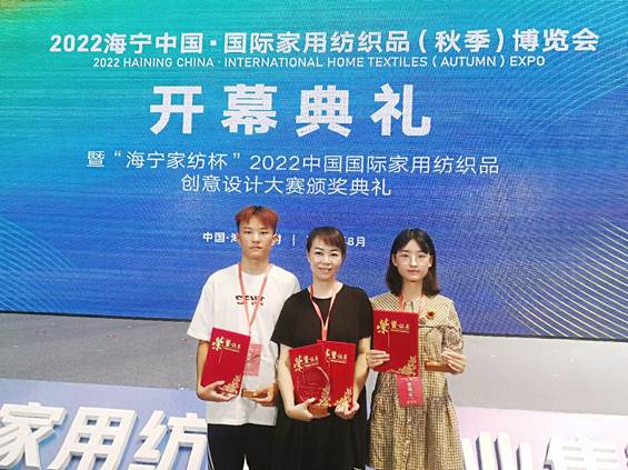 8月11日,2022“海宁家纺杯”中国国际家用纺织品创意设计大赛颁奖盛典在浙江海宁市家纺城国际贸易中心举行,我校创艺学院艺术设计212班何徐涛同学作品《见.素[xian su]》获得整体软装组银奖,并获得奖金1万元;艺术设计211班孙芙蓉同学作品《青铜器.语》荣获整体软装组评审团奖,并获得奖金5千元;创意画稿组和整体软装组共有8位同学获得优秀奖,奖金各1千元;另有40多名同学获入围奖;我校荣获优秀组织奖,创艺学院杨震华、王齐霜老师荣获优秀指导教师奖。
