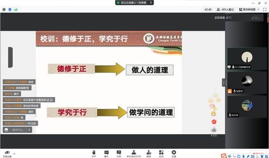 通过杨怡老师的生动讲解,同学们一步步了解到我校的发展历程。从初创时的国立中央技艺专科学校,到今天的成都纺织高等专科学校;从“假旧庙以迎新生”到坐落天府沃土犀浦。学校先后七更名称、七变隶属关系、六易办学地址,中途曾一度停止招生。辗转迁移,饱经沧桑,昔日的艰难困苦锻造出成纺今日古朴而深厚的历史底蕴。在八十多年的发展历程中,学校积淀并形成了“德修于正、学究于行”的校训和“团结、勤奋、求实、创新”的校风。看似寻常最奇崛,成如容易却艰辛。一幅幅老照片让同学们深刻认识到学校一路发展的不易,从中学习到了一代代成纺人八十多年来坚守着的严谨治学、不畏困难、积极进取的优良传统以及甘愿为国奉献的家国情怀。